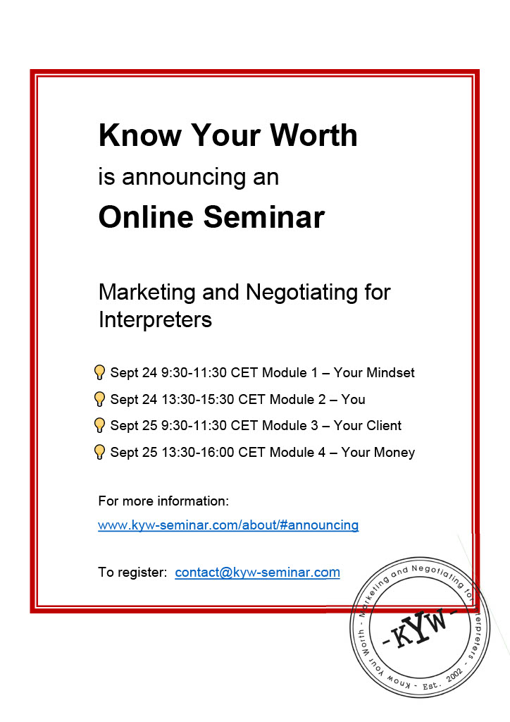 With an eye to giving you new tools to understand how to manage your business, we are offering the Know Your Worth Online Seminar on Marketing and Negotiating for Interpreters.